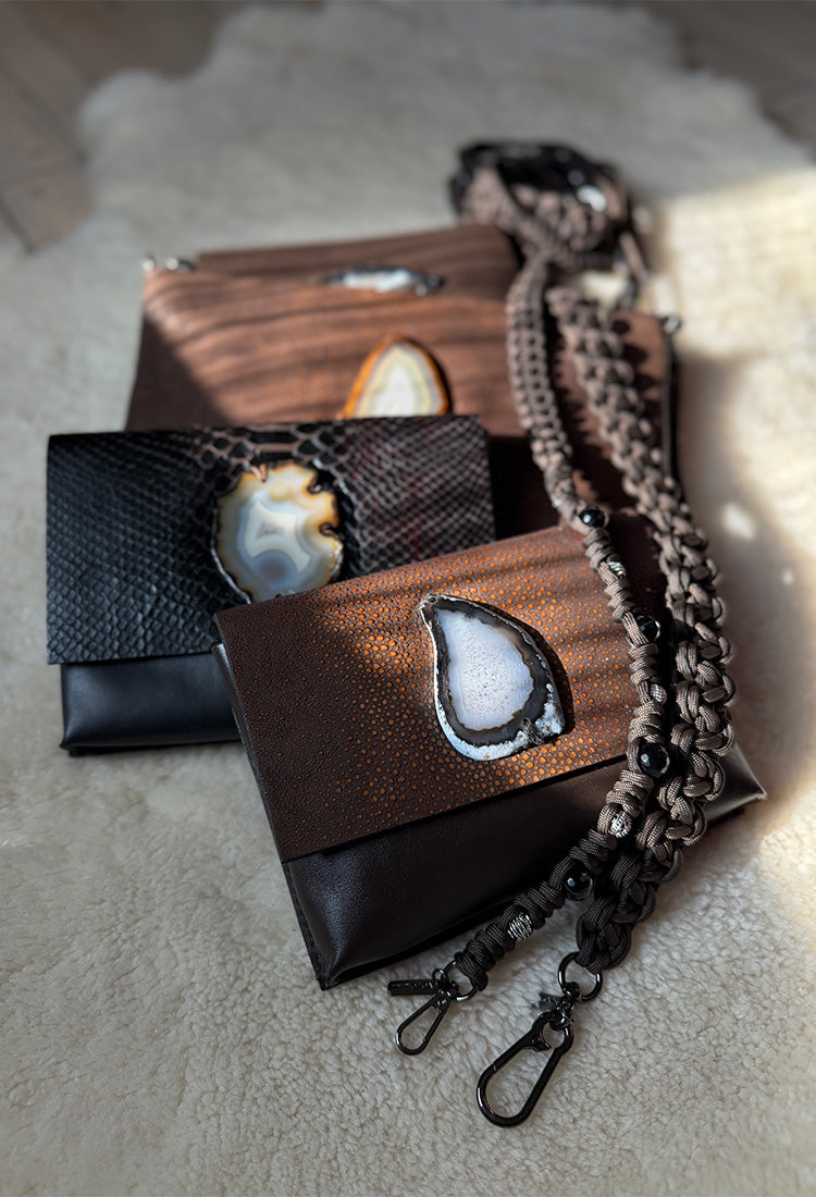 Evoke your presence to the present moment through the touch of leather, fur, and precious stone.