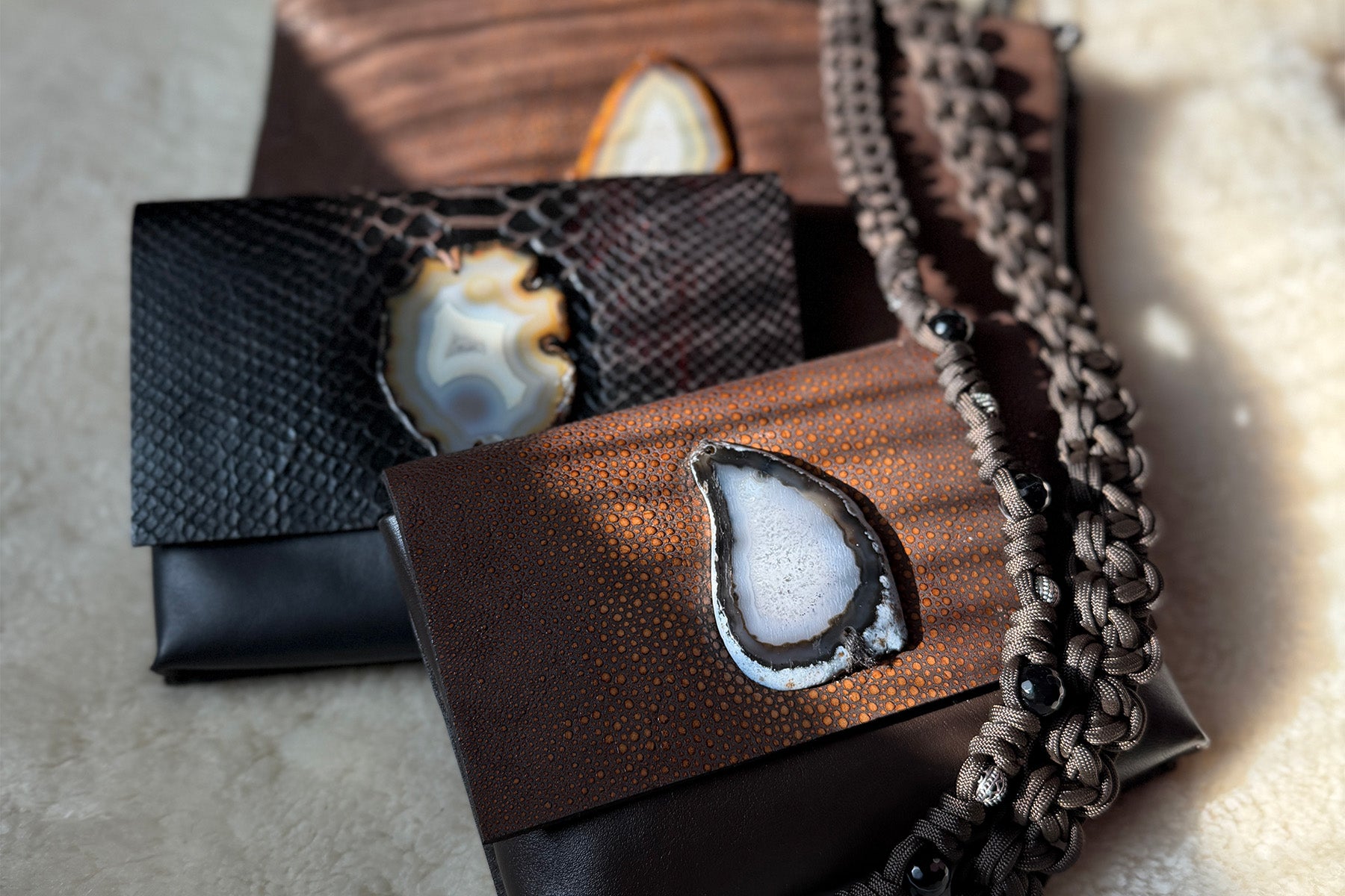 Evoke your presence to the present moment through the touch of leather, fur, and precious stone.