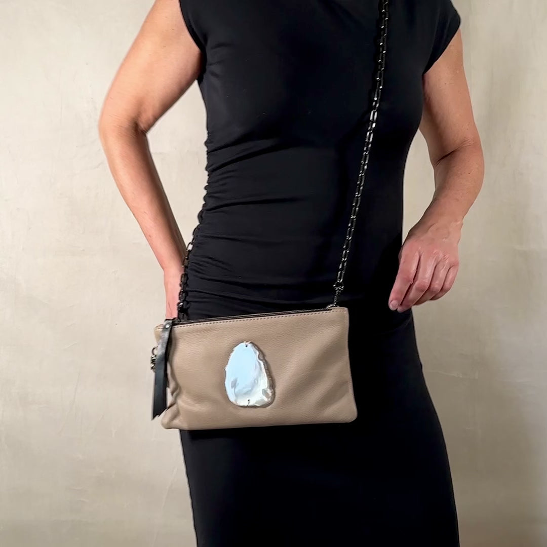 The Fringe Bag is your stylish festival companion, crafted from smooth black Italian leather and adorned with our signature agate stone. Designed for versatility, it can be worn crossbody, over the shoulder, or around the waist. The detachable chain strap can easily be swapped for any of our decorated shoulder straps to match your style.